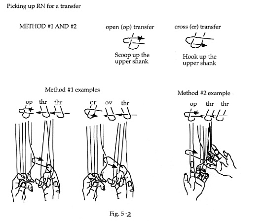 Using the right OP, make a shed (“thr”, “updn,” or “ov,”) with the loops mounted on the fingers between OP and RN. (RN is on the left hand).Scoop up (opn) or hook up (cr) the upper shank of RN and pull it out through the shed. The RN is now transferred to OP.