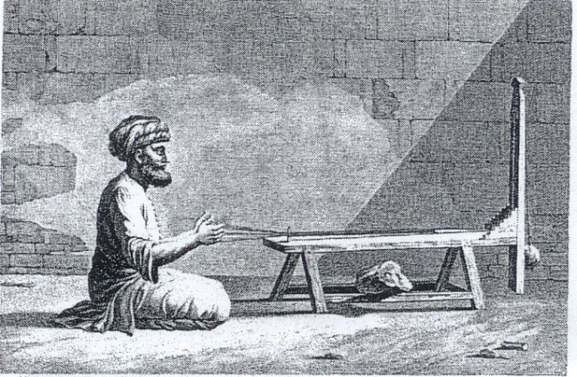The Egyptian braider is working with his arms bent at chest height and the palms facing each other while squatting on the floor facing the short side of a long low table or a bench. The loops are mounted on his fingers. The fell of the braid is resting on the nail-like post 7~9 cm high which stands closer to the braider’s end of the bench. This is the beating device. By pulling the arms backwards and beating the fell against the post, he tightens the braid. Here he is manipulating the loops. He can keep the braid structure from becoming loose by resting the fell at the beater while manipulating. The braid runs along the length of the bench and reaches to a vertical slat which stands on the other end of the bench, and from there it starts climbing upwards. After reaching to the top of the slat about 60 cm high it goes over and starts going down behind the slat by the pull of a weight attached to the head of the braid. The weight not only stabilizes the head, but also controls the firmness of the braid. This device by its minimal implementation provides a beater with the mechanism to move the point of impact (the fell) forward as the braid is constructed.